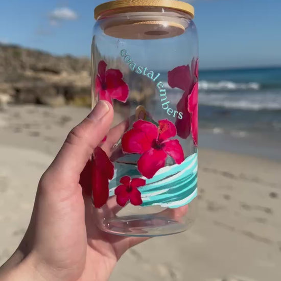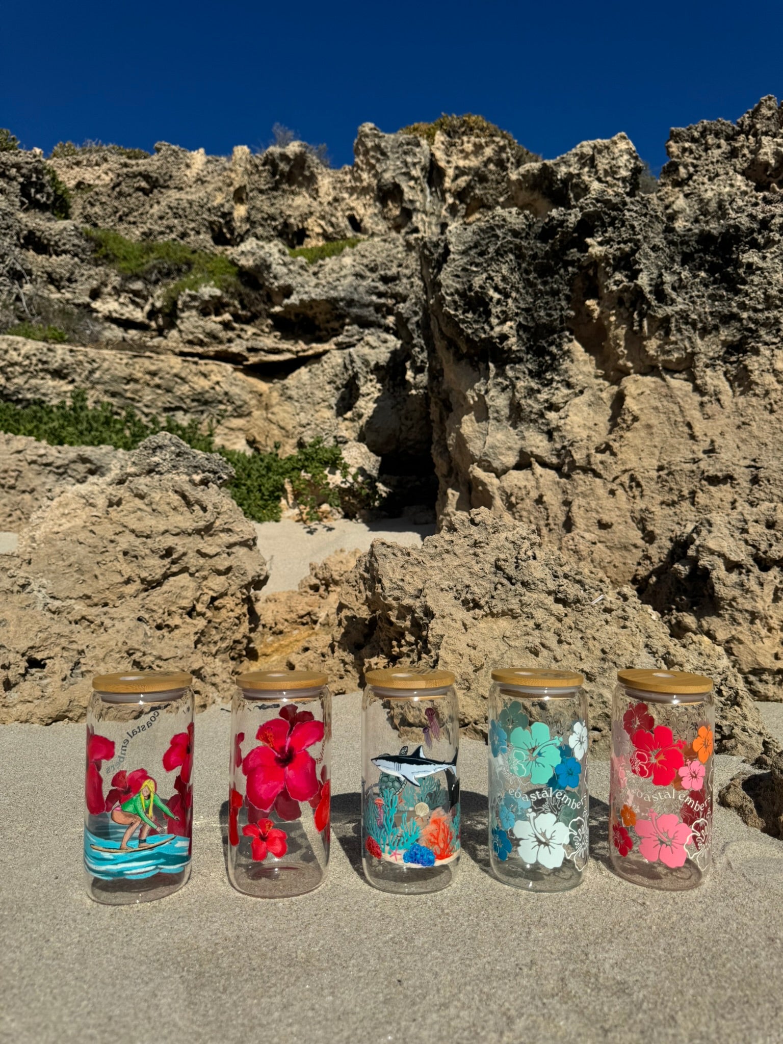 Keep cool and refreshed with our glass tumblers featuring our original designs, each one adorned with a UV DTF sticker applied by hand. The double-sided design creates a vibrant, eye-catching effect that shines from every angle. Completed with a glass straw and bamboo lid, they’re perfect for your on-the-go summer sips.